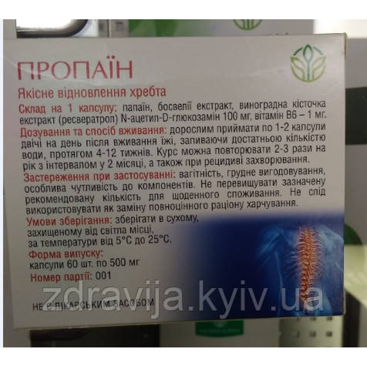 Склад на 1 капсулу: Папаїн, екстракт босвелії, екстракт виноградної кісточки (ресвератрол), N-ацетил-D-глюкозамін 100 мг, вітамін В6-1мг.