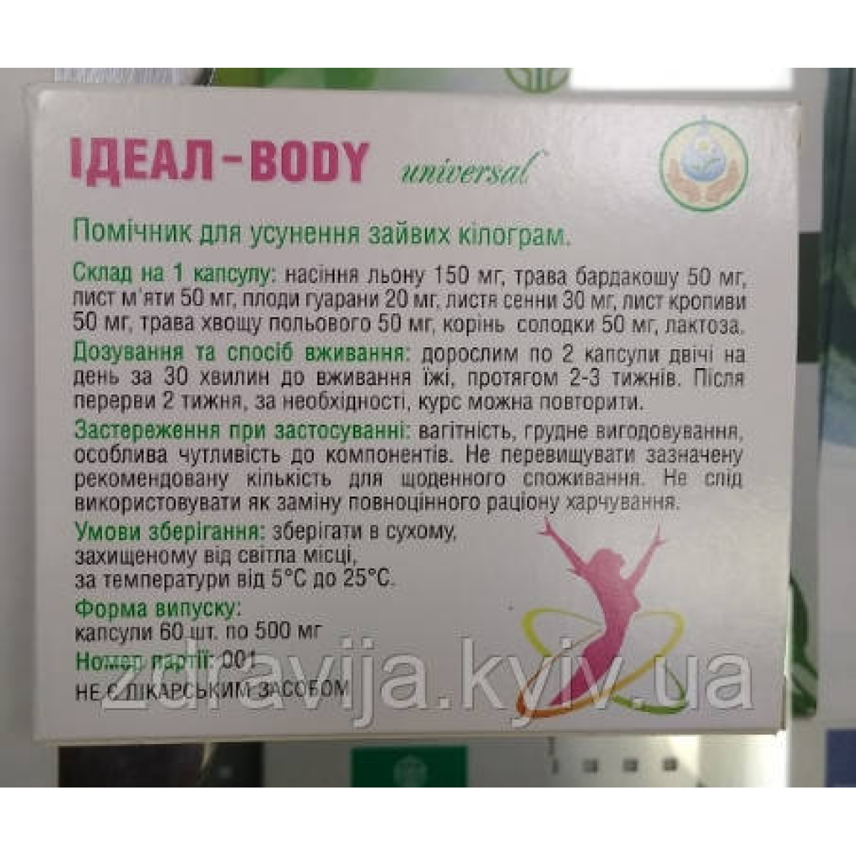 Ідеал-боді універсал - ваш натуральний помічник у боротьбі з зайвою вагою та покращенні здоров“я. Завдяки унікальному складу, цей комплекс сприяє спалюванню жиру, покращує обмін речовин, поліпшує відтік жовчі для ефективнішого розщеплення жирів та швидшого перетравлення їжі. Він допомагає зменшити апетит та тягу до солодкого, а також зменшує прояви целюліту, підвищує еластичність та пружність шкіри. Складений із натуральних інгредієнтів, таких як насіння льону, трава бардакош, лист м“яти та інші, цей комплекс допоможе вам досягти бажаних результатів у корекції ваги та підтримці здоров“я.