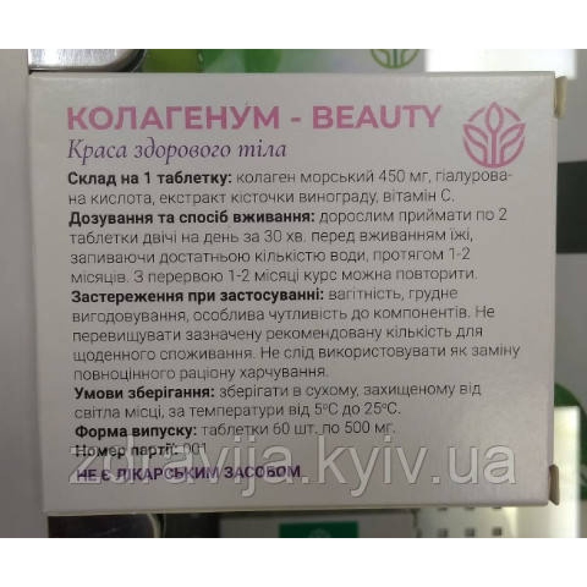 Склад: колаген морський 450мг., гіалуронова кислота, екстракт кісточки винограду, вітамін С.