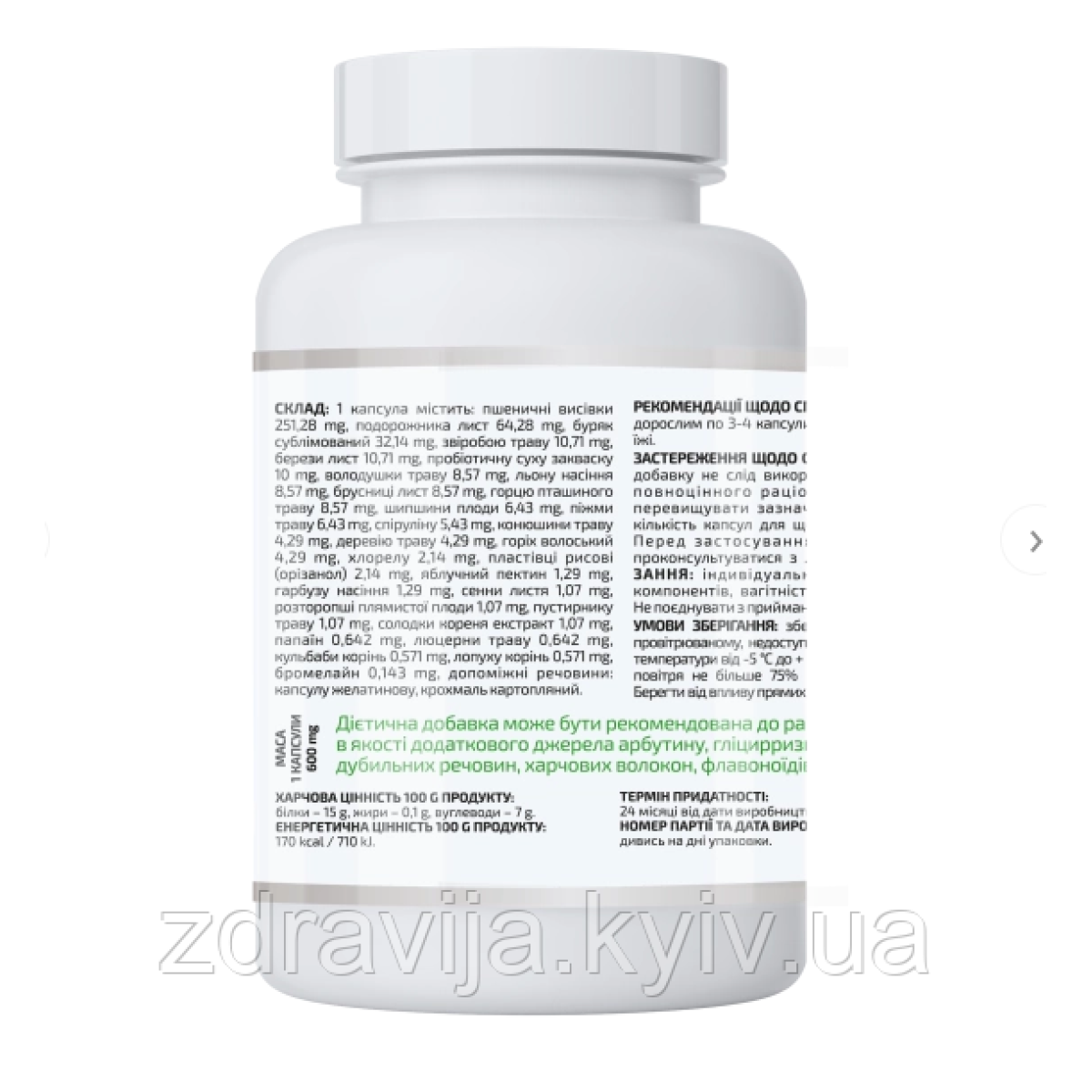 Входять до складу комплексу лист подорожника, сублімована буряк, пшеничні висівки, яблучний пектин надійно зв“язують і виводять з організму радіонукліди, солі важких металів, токсичні метаболіти. В шлунку під впливом харчових волокон цих інгредієнтів сповільнюється евакуація їжі, завдяки тривалому перетравлюванню створюється відчуття ситості. Харчові волокна значно прискорюють просування їжі по шлунково-кишковому тракту,