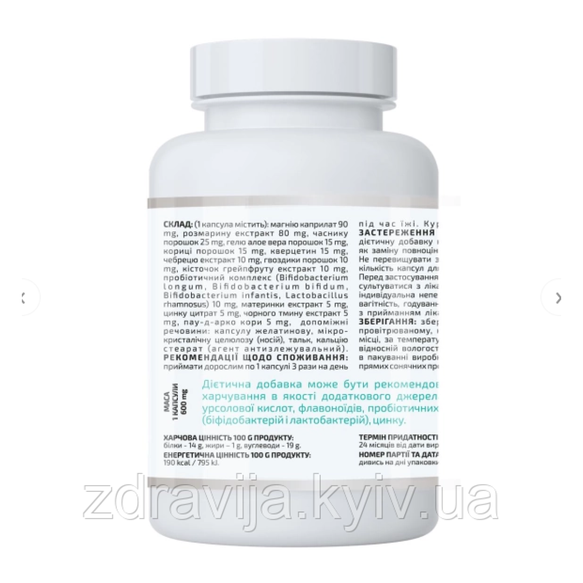 Пробіотичний комплекс (5 штамів) — відновлює мікрофлору після антибіотиків та пригнічення біоти грибком.