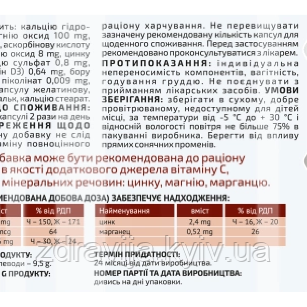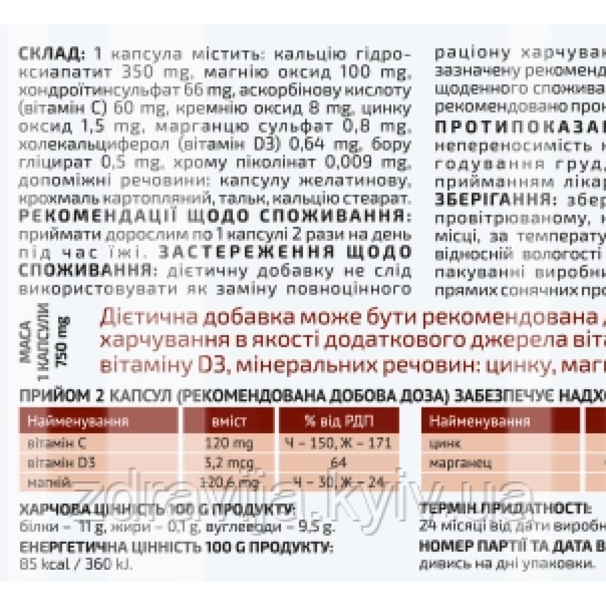 Склад: Кальцію гідроксиаппатит 350,00 мг Магнію оксид 100,00 мг Хондроїтинсульфат 66,00 мг Вітамін С 6000 мг Кремнію оксид 8,00 мг Цинку оксид 1,50 мг Марганцю сульфат 0,80 мг Бора глицират 0,50 мг Хрома піколінат 8,50 мкг Вітамін Д3 1,60 мкг